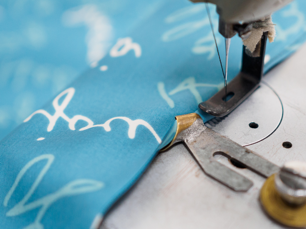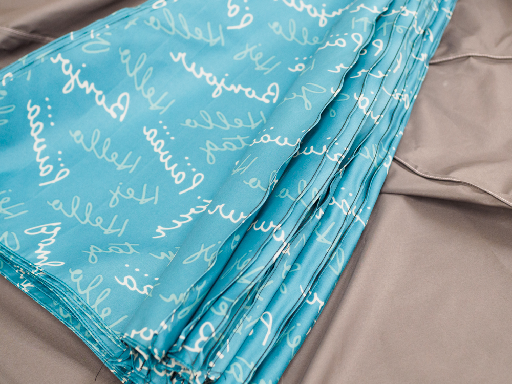 「撥水加工が施されていたり、生地によって硬さや滑りやすさが違います。だから常に手の感覚でコマを合わせて微調整しながら、同じリズムでミシンをはしらせていかないと、どこかにズレが生じてしまうんですよね」。生地は素材の違いに加え、織り目の方向によってコマの長さが違ったりすることもあって、きちんと合わせて縫うには熟練の技術を要します。