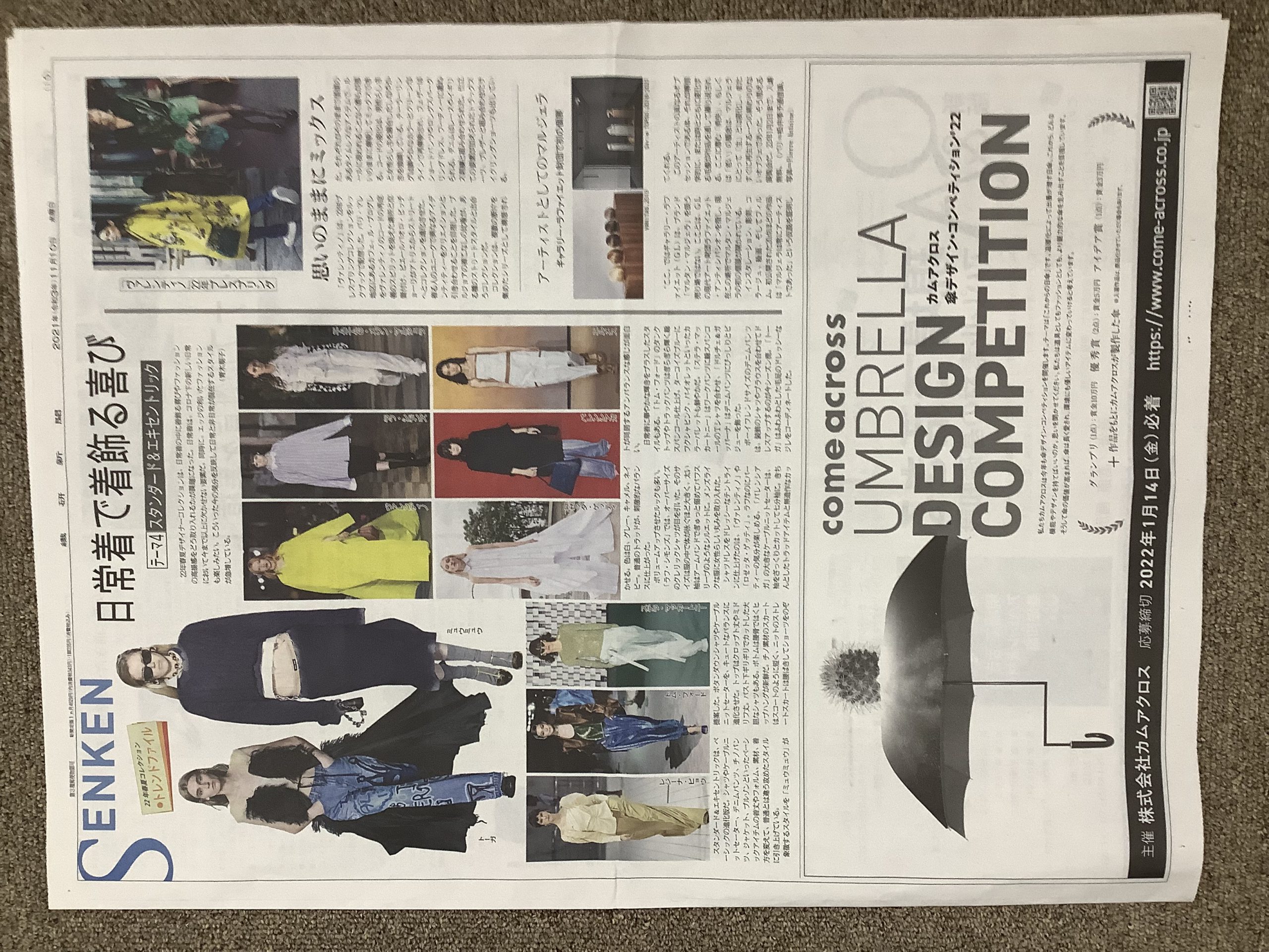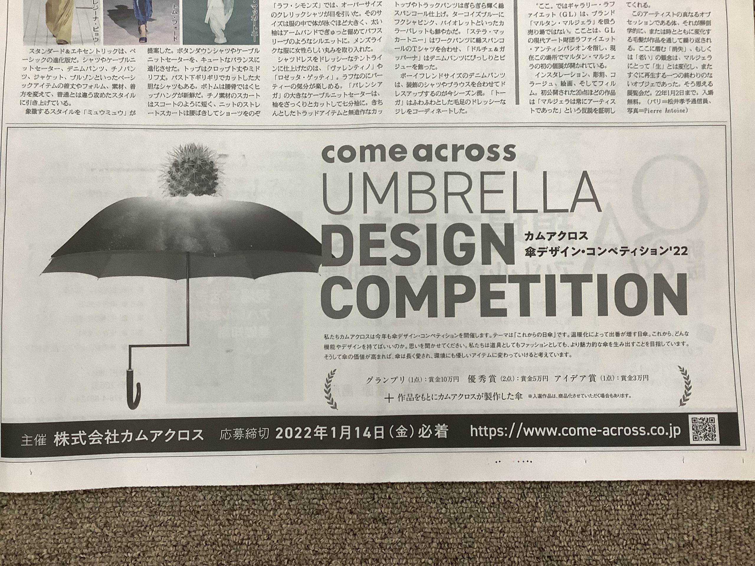 最新情報 TOPICS TOP > 最新情報 > 傘デザインコンペ広告 2021.11.10 メディア掲載 傘デザインコンペ広告 第2回カムアクロス傘デザインコンペの広告記事が11/10に繊研新聞に掲載されました。 一覧ページへ戻る